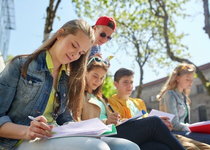 Elever som jobber med skolearbeid utendørs. Illustrasjonsbilde. - Klikk for stort bildeDet er sommerskole på Lillehammer og Kongsvinger i 2026. Mostphotos